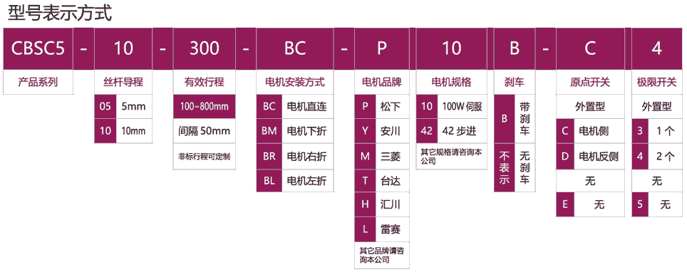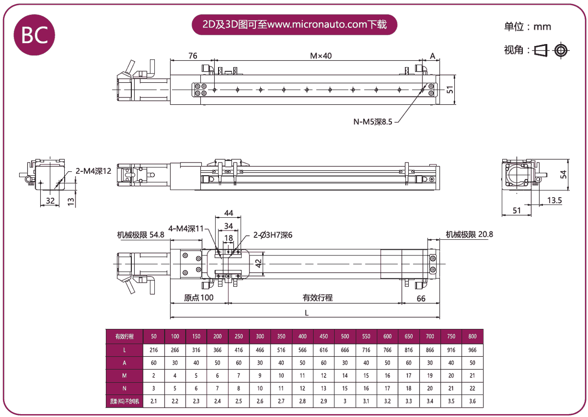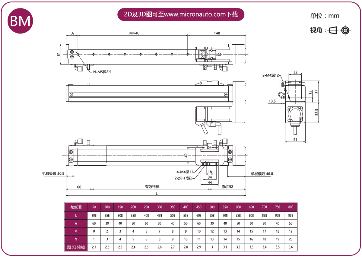 標準有效行程: 100~800mm(間隔50mm)